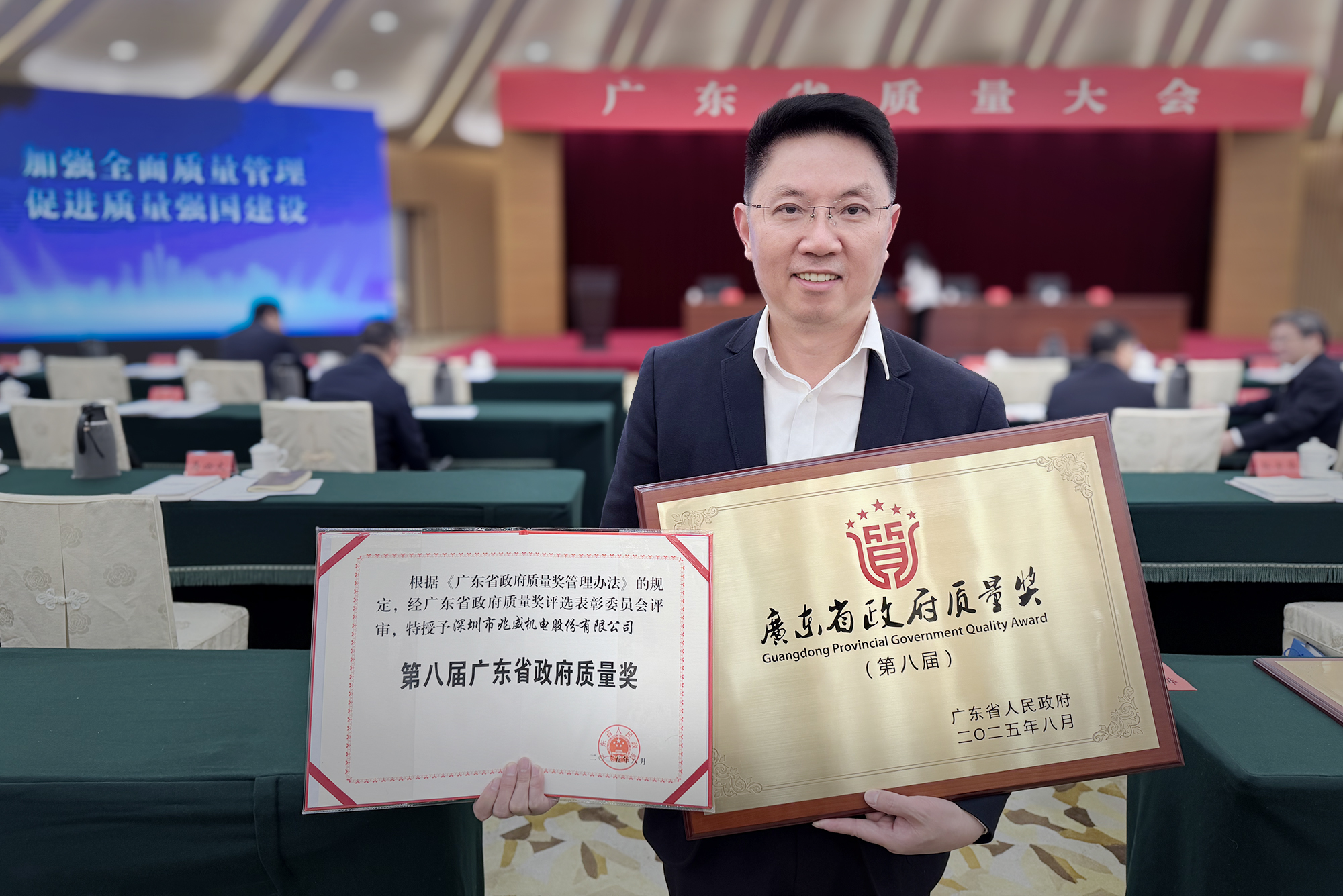 喜讯捷报传,荣耀启新程!2025 年 11 月 26 日,广东省质量大会上,深圳市j9国际站登录机电股份有限公司董事、总经理叶曙兵先生正式接过第八届广东省政府质量奖奖牌。j9国际站登录机电是2025年深圳唯一入选企业,跻身全省仅 10 家的获奖名单,用卓越实践铸就质量领域的至高荣光。